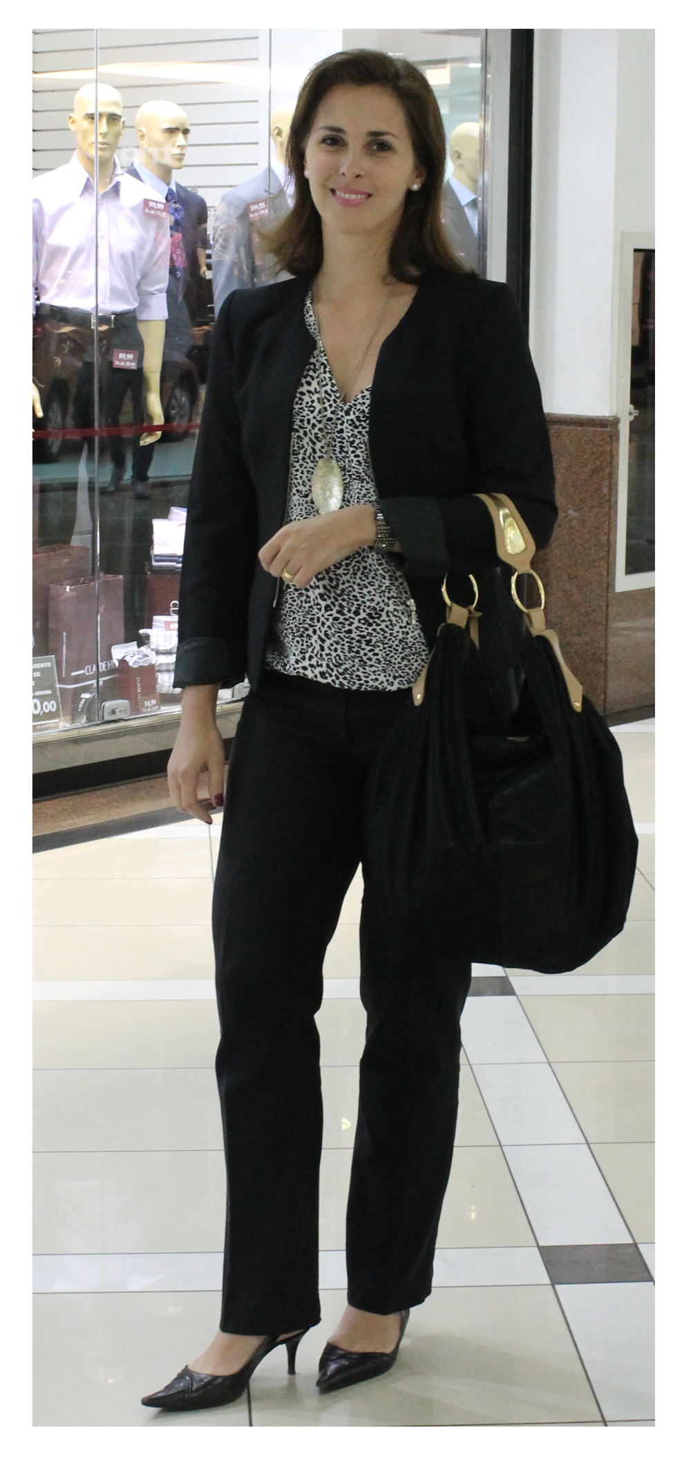 Com uma produção mais sóbria e elegante, a Priscilla mostra como um look para o trabalho pode ficar mais feminino com os acessórios certos.
